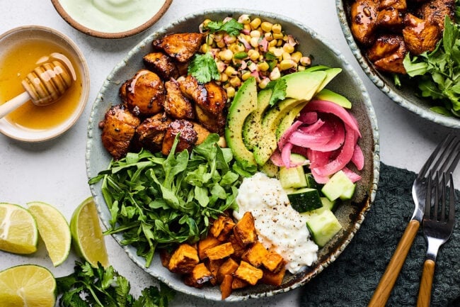 - To assemble the bowls, divide the ingredients evenly between bowls. You can make 4 to 6 bowls, depending on how hungry you are. Start with the arugula, then add cooked chicken, roasted sweet potatoes, cottage cheese, cucumber, avocado, pickled red onions, and corn salsa, if using. Drizzle with hot honey and garnish with cilantro, if desired. The bowls don't need a dressing, but if you want extra flavor and like sauce, you can drizzle with jalapeño ranch. Serve and enjoy!