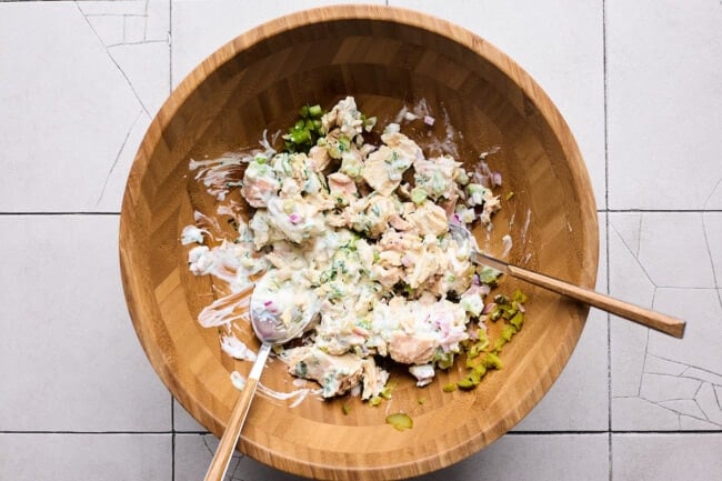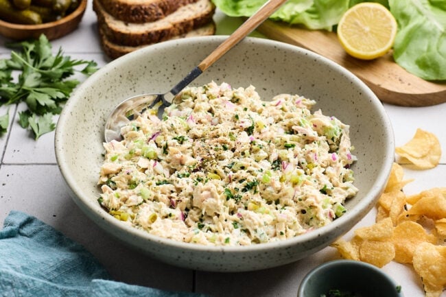 It's creamy (but not too creamy), has the perfect amount of crunch, and is packed with fresh, zippy flavor. We lighten things up a bit with Greek yogurt, but still keep a touch of mayo for that classic taste. Then we add crunchy celery, red onion, tangy dill pickles, a little parsley for freshness, and just enough Dijon and lemon juice to make it sing.
